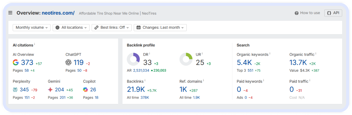 Screenshot from Ahrefs showing NeoTires.com backlink profile with metrics like domain rating, referring domains, backlinks, AI citations, organic keywords, and traffic growth.