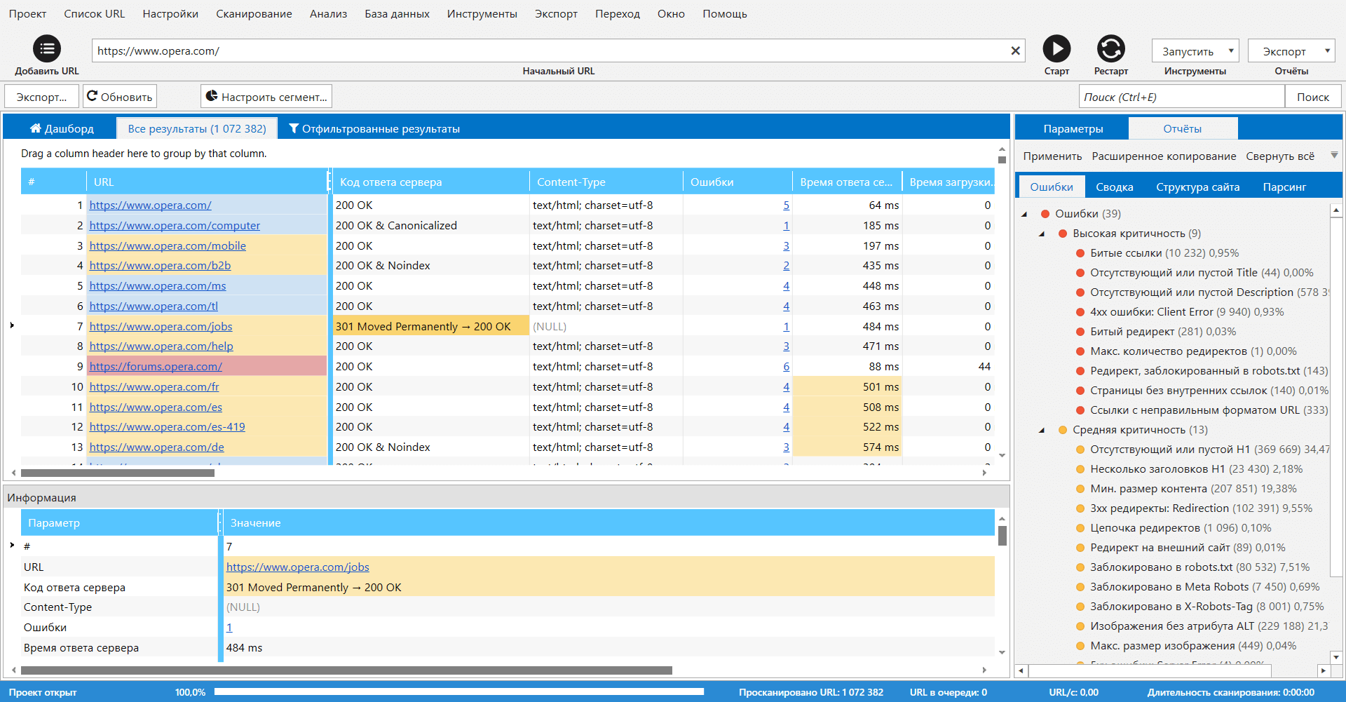 Assurez-vous que tous les liens internes sont valides et ne mènent pas à des pages 404. Cela peut être fait en utilisant n'importe quel crawler disponible : Screaming Frog, Netpeak Spider et d'autres programmes et services.