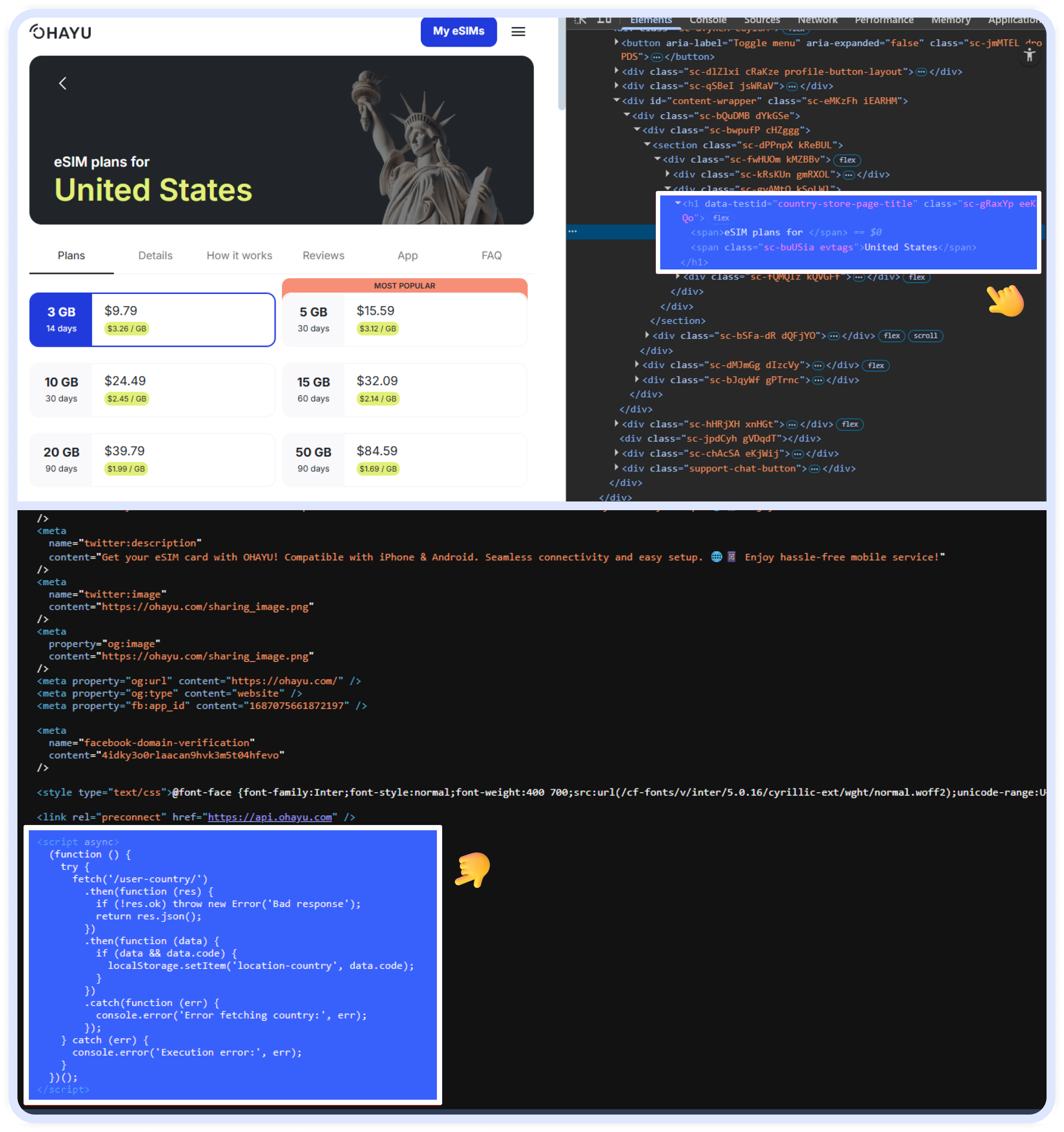Приклад: перевірте сторінку https://ohayu.com/esim/united-states-us/, перегляньте елементи SPA-сторінки в браузері, і побачите, що всі заголовки та контент знаходяться на своїх місцях. Але якщо переглянете джерело за допомогою view-source:https://ohayu.com/esim/united-states-us/, побачите лише стандартний скрипт без контенту.